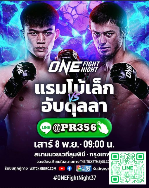 สมัครเลยตอนนี้ คลิกที่นี่เพื่อแอดไลน์ @PR356 https://page.line.me/PR356 แล้วมาลุ้นไปกับทุกไฟต์ดุเดือดของศึก ONE ลุมพินี