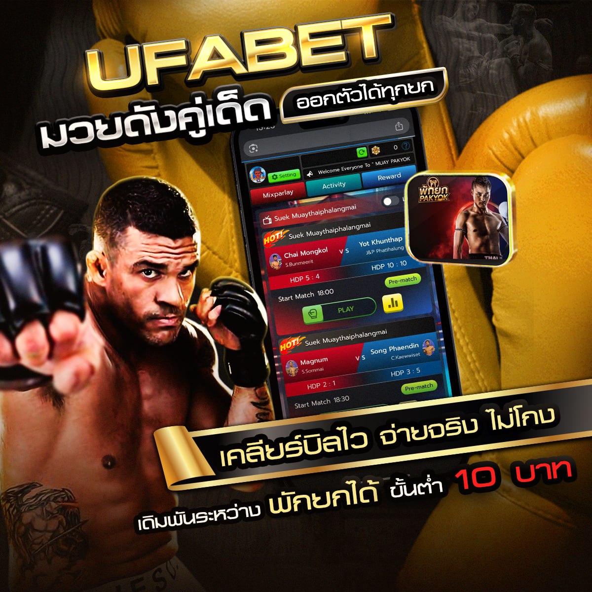 เว็บมวยพักยก UFABET ที่พร้อมให้คุณเดิมพัน ไปกับเบทขั้นต่ำเพียง 10 บาทเท่านั้น ไม่ว่าคุณจะมีทุนน้อยมากแค่ไหน ก็สามารถร่วมสนุกไปกับเราได้ นอกจากนี้ยังสามารถเดิมพันได้สูงสุดถึง 5,000 บาทต่อคู่ พร้อมทั้งมีมวยสดให้ผู้เล่นรับชมทุกคู่ ภาพสวยเหมือนไปยืนเชียร์ข้างเวทีมวย แทงมวยพักยกออนไลน์ เดิมพันสนุก ไปกับทุกการเดิมพันต้อง เว็บแทงมวยครบวงจร ที่นี่เท่านั้นมวยพักยก เว็บพนันมวยออนไลน์ติดกระแสในไทยมากที่สุด เล่นง่าย จ่ายไม่อั้น แอดไลน์ เพื่อติดต่อ สอบถาม