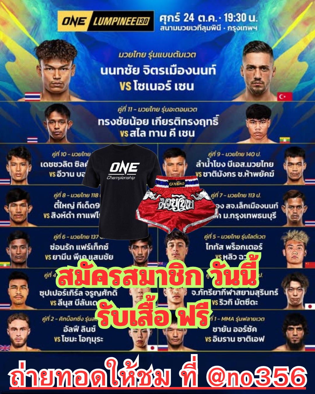 เว็บมวย One ที่เปิดให้แทงมวย One Championship แบบสดๆ ครบทุกคู่ แทงได้ทุกคู่ ราคาเริ่มต้นที่ 10 บาทต่อคู่ เว็บไซต์อันดับ 1 ที่มั่นคงบริการรวดเร็วทันใจ การเงินชัวร์ 100% อย่ารอช้าคลิกแอดไลน์ไปสมัครเลย >> @no356