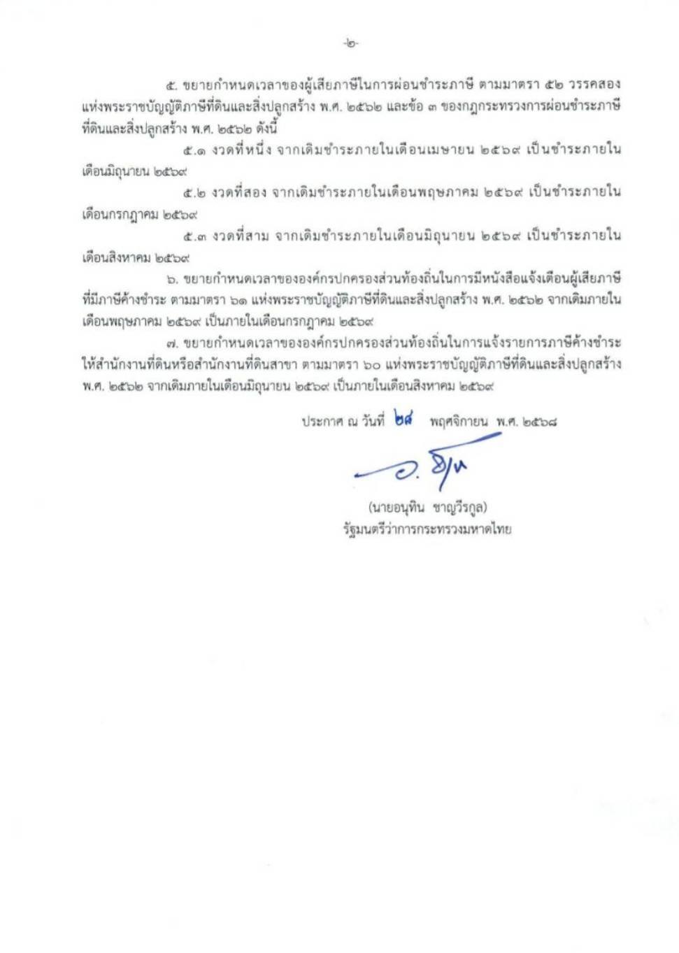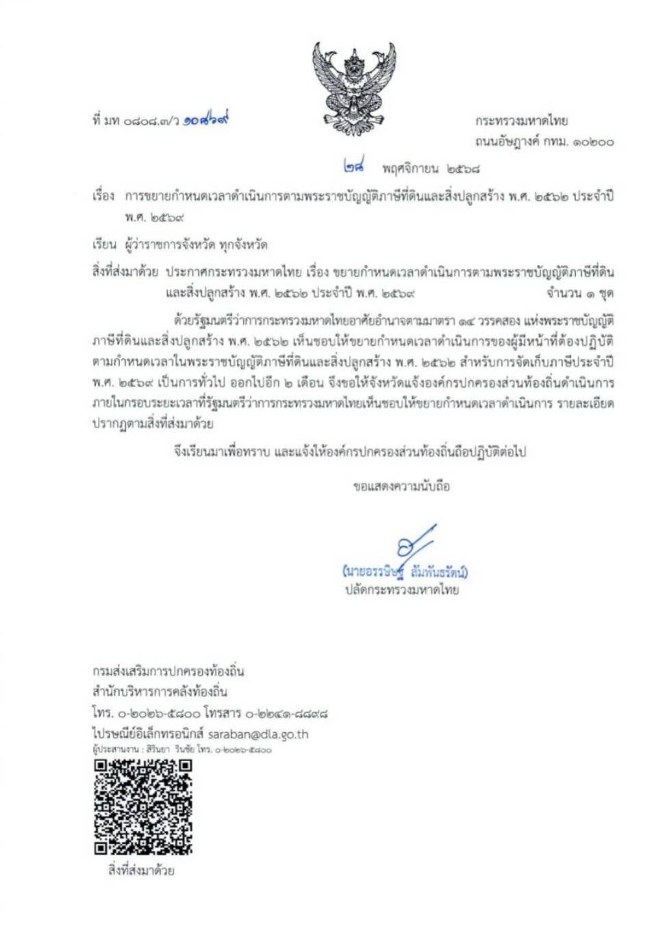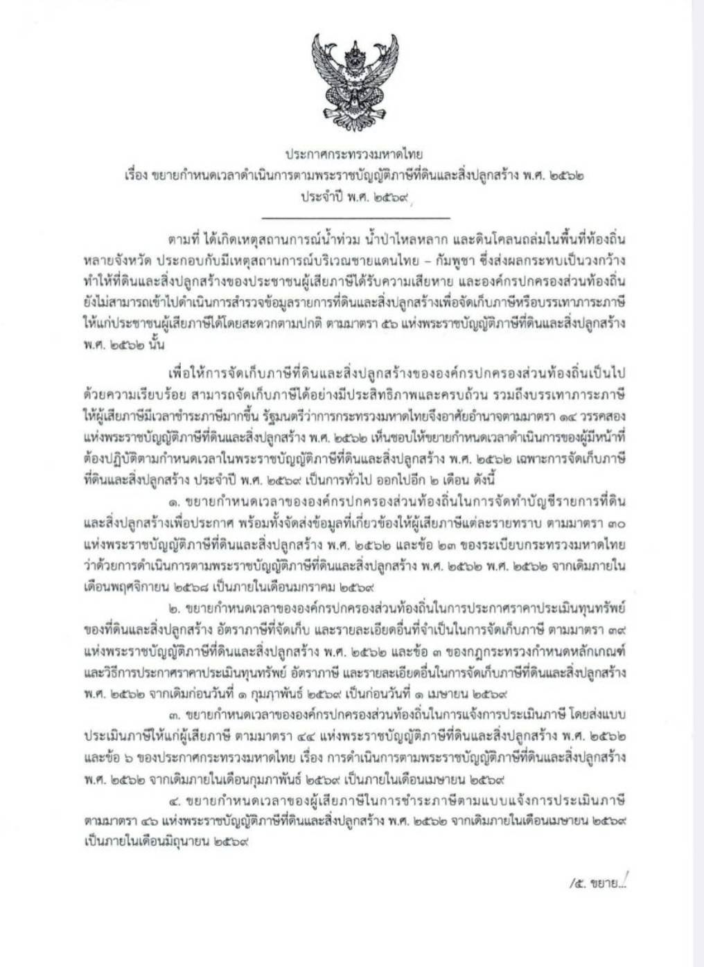 ประกาศกระทรวงมหาดไทย เรื่อง ขยายกำหนดเวลาดำเนินการตามพระราชบัญญัติภาษีที่ดินและสิ่งปลูกสร้าง พ.ศ. 2562 ประจำปี พ.ศ. 2569 0 Share FacebookTwitterEmailFacebook MessengerLINE