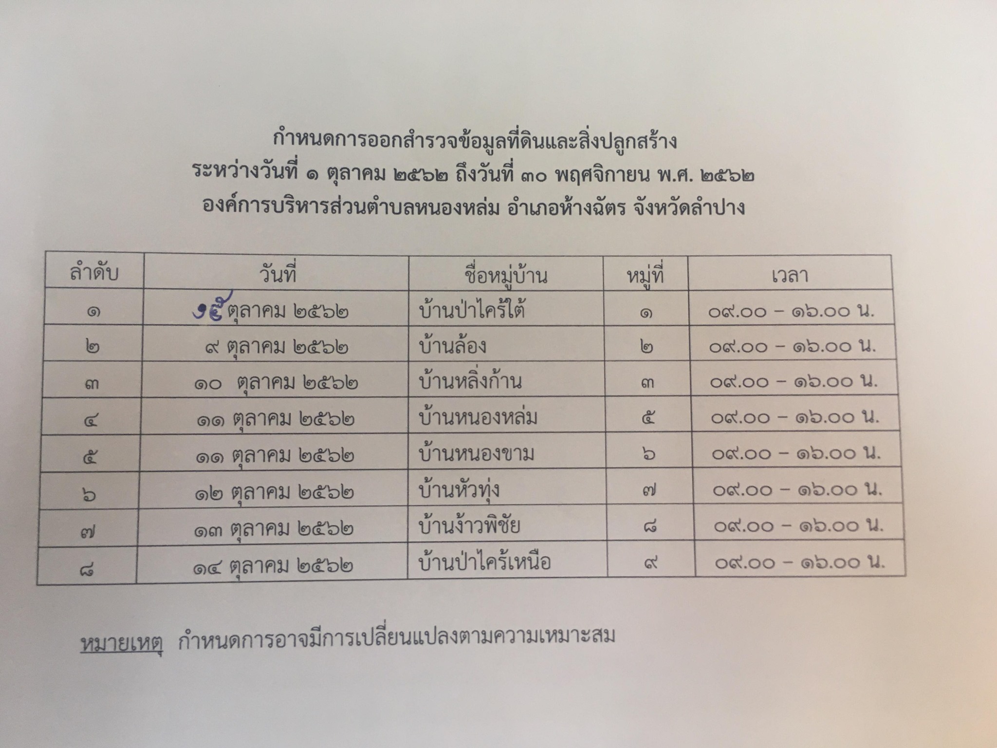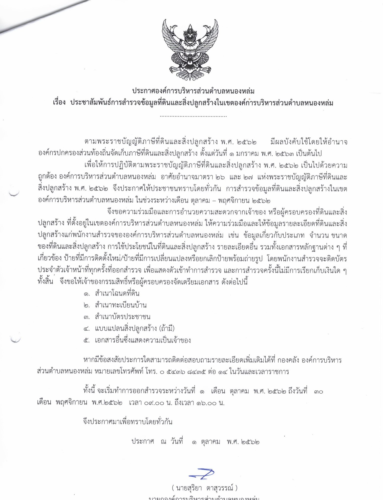 ประกาศ เรื่อง การสำรวจข้อมูลที่ดินและสิ่งปลูกสร้างในเขต อบต.หนองหล่ม