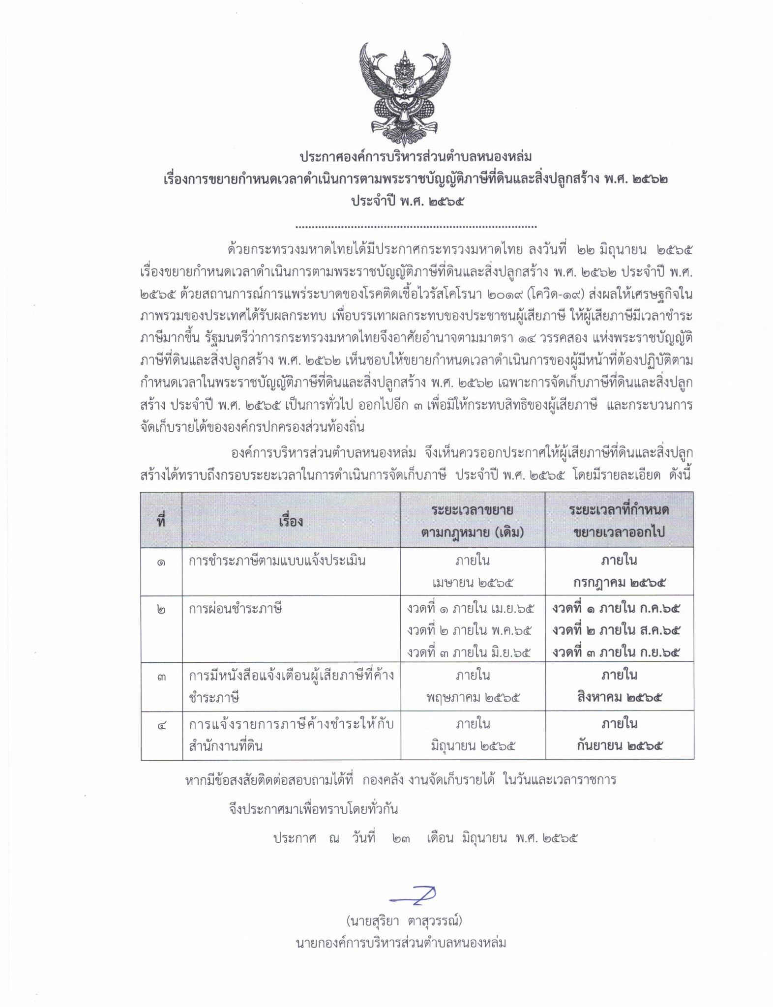 ประกาศขยายระยะเวลาชำระภาษีที่ดินและสิ่งปลูกสร้าง ประจำปี 2565 0 Share FacebookTwitterEmailFacebook MessengerLINE