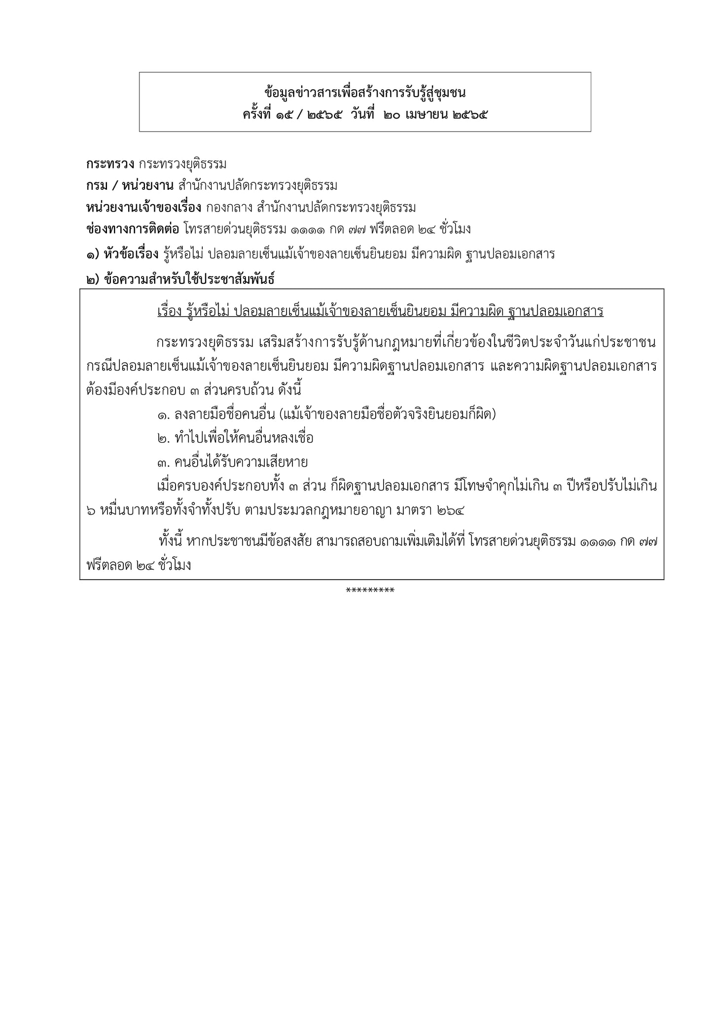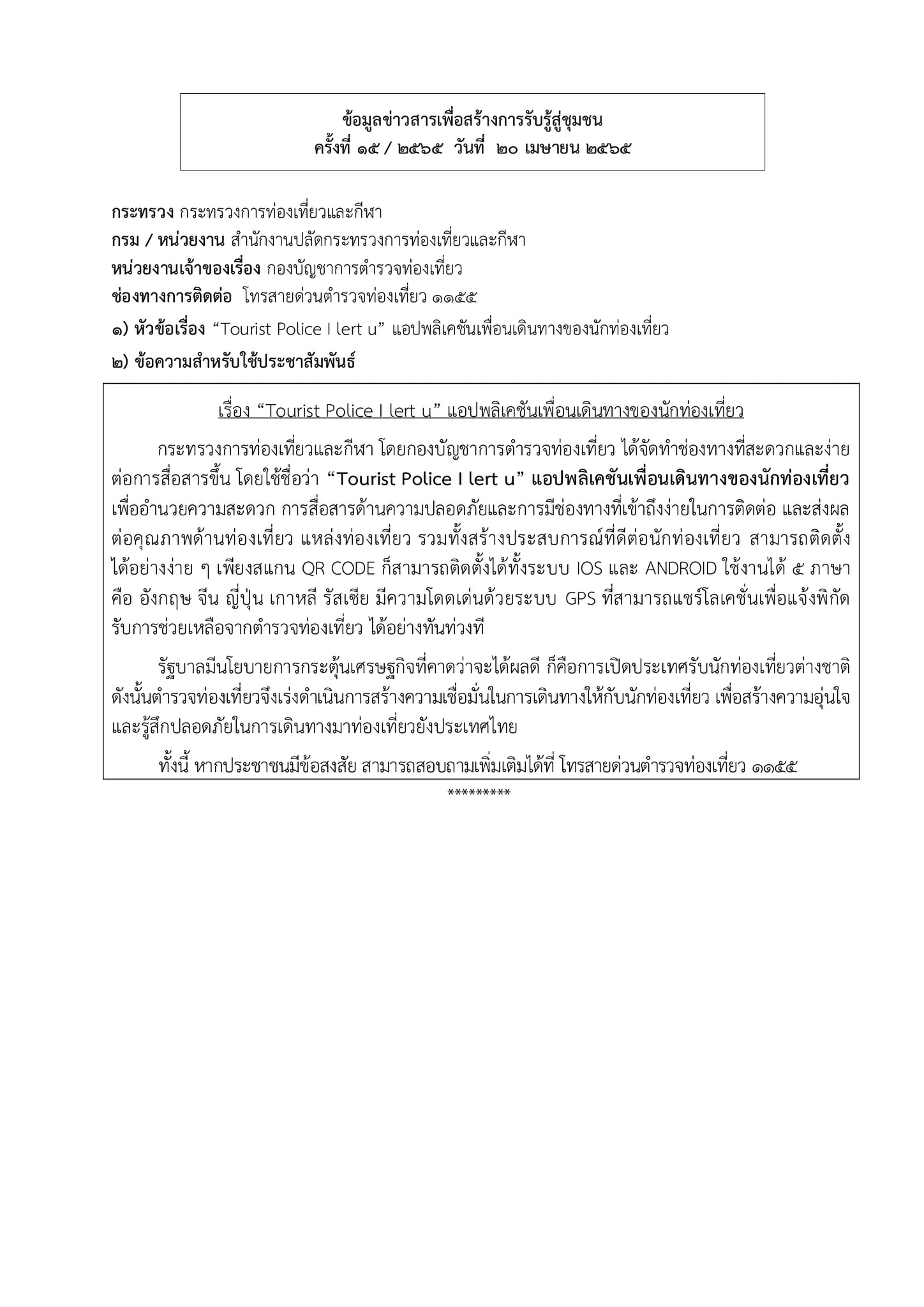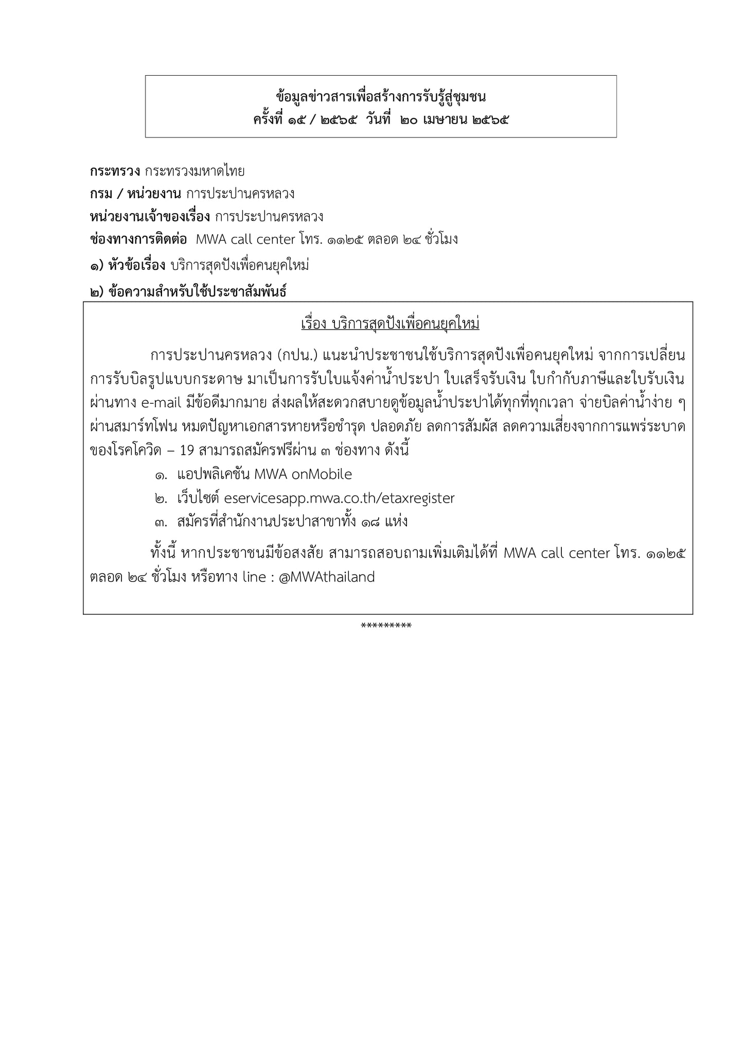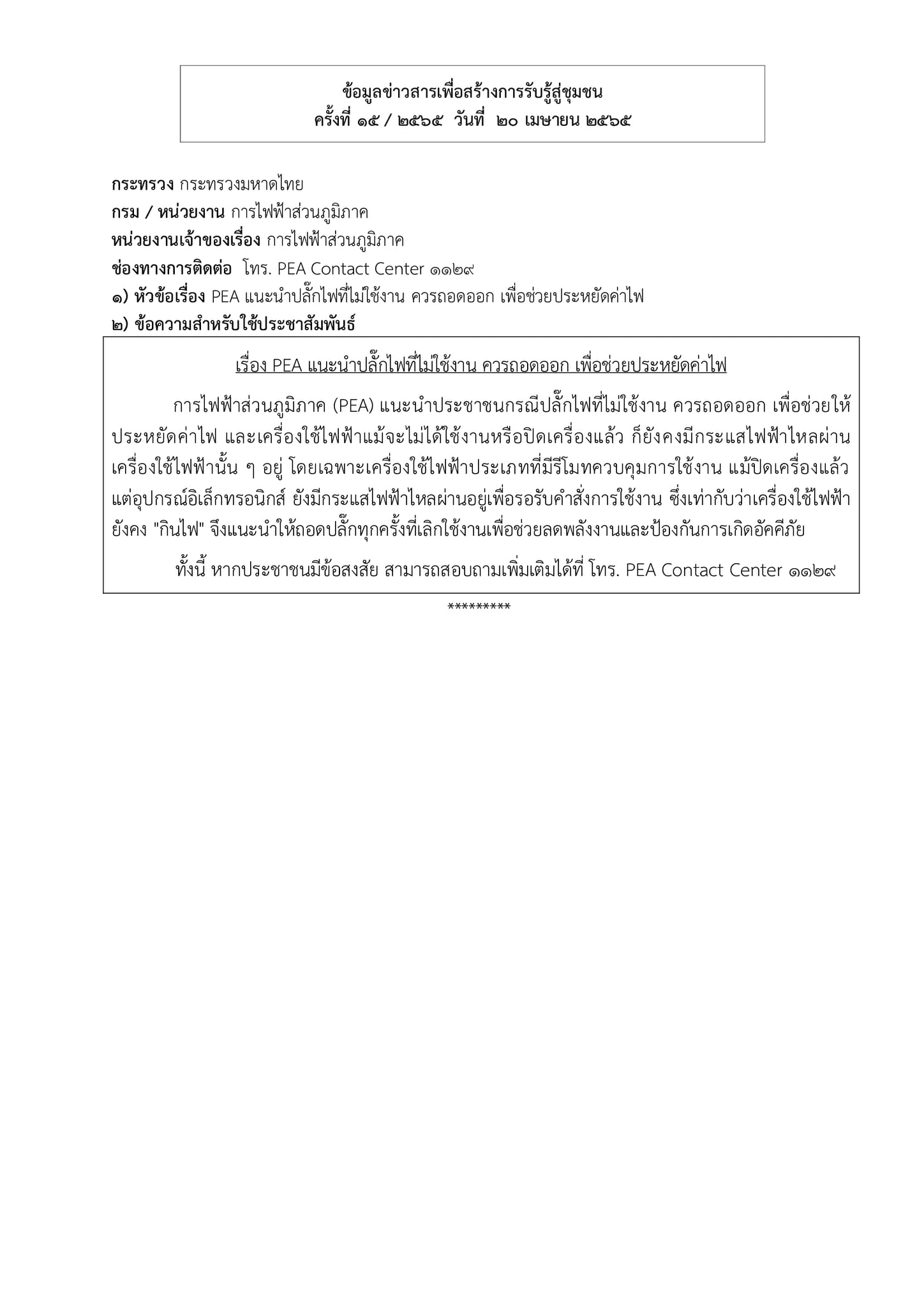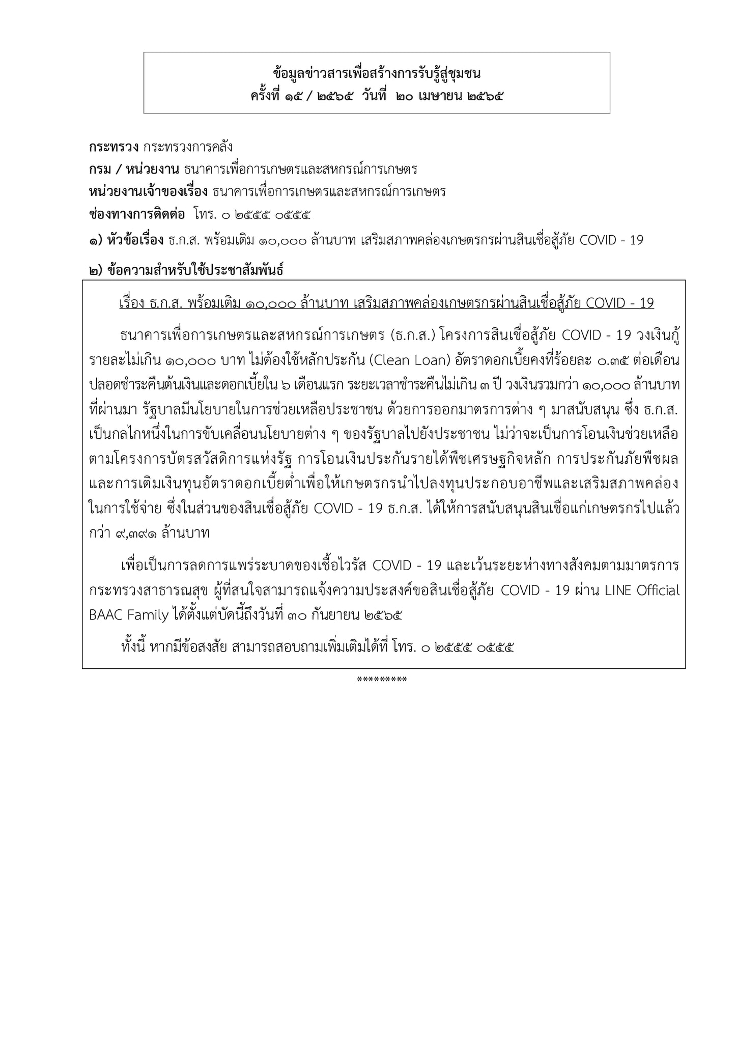 ข้อมูลข่าวสารเพื่อสร้างการรับรู้สู่ชุมชนครั้งที่ 15/2565 ข้อมูลข่าวสารเพื่อสร้างการรับรู้สู่ชุมชนครั้งที่ 15/2565 0 Share FacebookTwitterEmailFacebook MessengerLINE