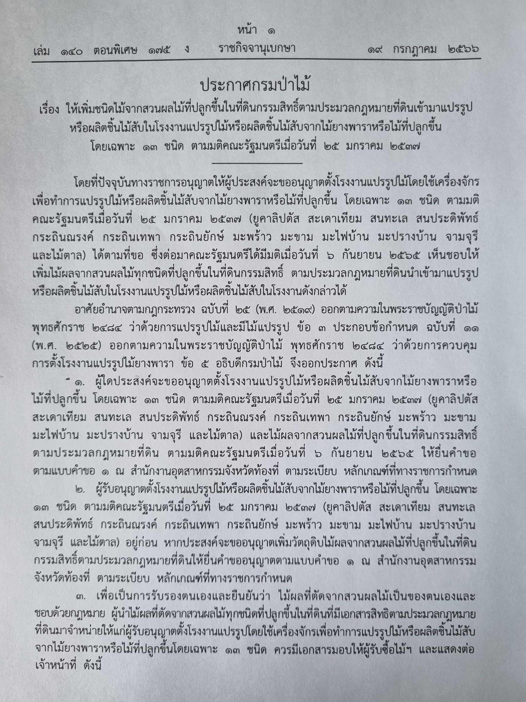 ประกาศกรมป่าไม้ เรื่อง ให้เพิ่มชนิดไม้จากสวนผลไม้ที่ปลูกขึ้นในที่ดินกรรมสิทธิ์ฯ นำเข้ามาแปรรูปหรือผลิตชิ้นไม้สับในโรงงานฯ ได้ 0 Share FacebookTwitterEmailFacebook MessengerLINE