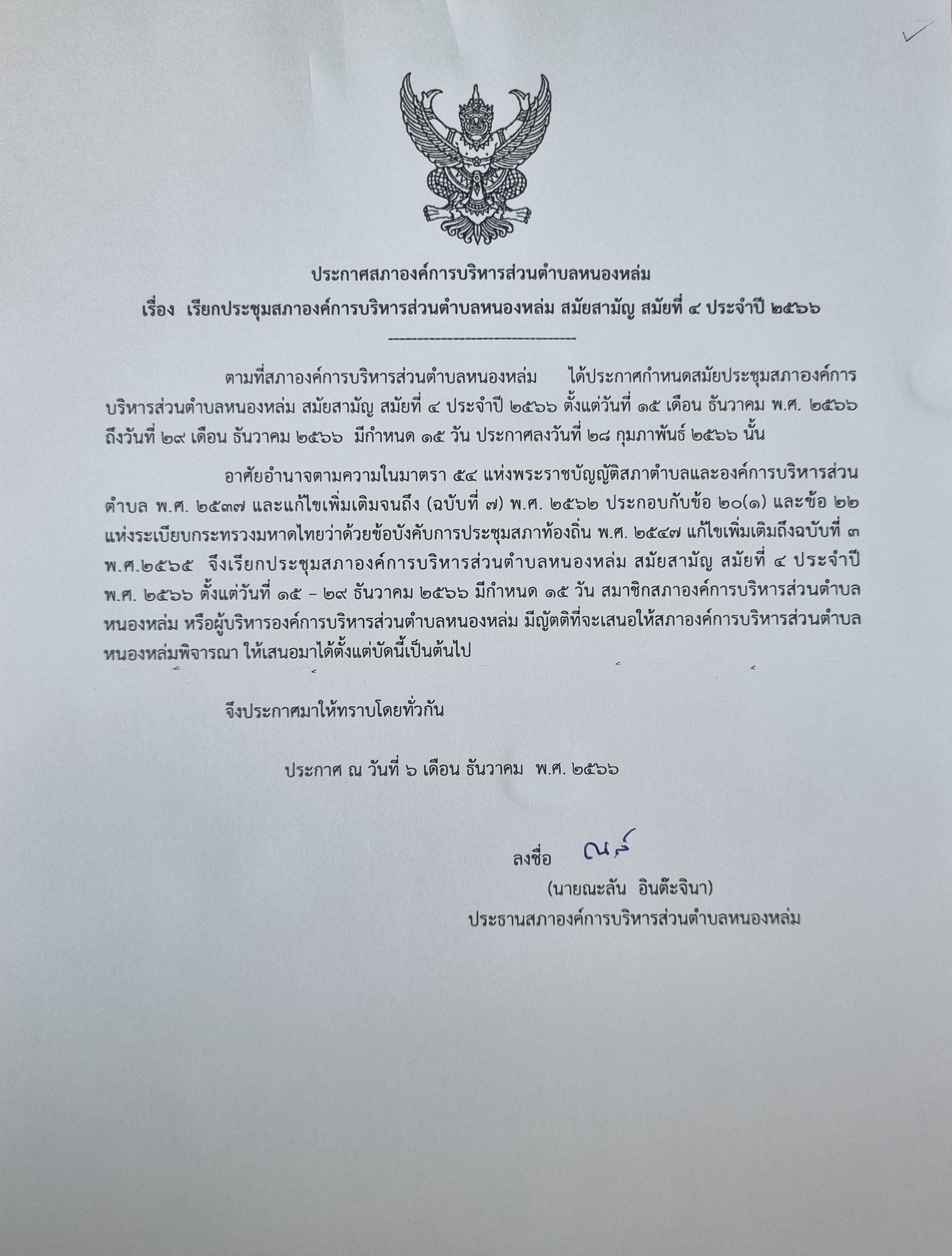 ประกาศเรียกประชุมสภาองค์การบริหารส่วนตำบลหนองหล่ม สมัยสามัญ สมัยที่ 4 ประจำปี 2566 ระหว่างวันที่ 15 – 29 ธันวาคม 2566 มีกำหนด 15 วัน 0 Share FacebookTwitterEmailFacebook MessengerLINE